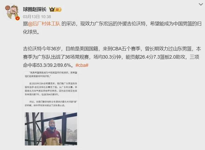 值得一提的是,吉伦沃特曾在接受采访时,亲口表态愿意被中国男篮归化......