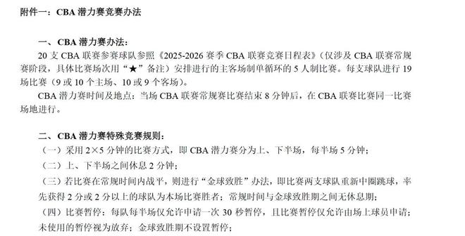 北京时间11月17日,据“球圈赵探长”等多位媒体人消息,CBA新赛季将设额外的“潜力赛”。部分赛事规程节选CBA比赛结束八分钟后同一场地举办CBA潜力赛,参赛球员是非首发比赛的本