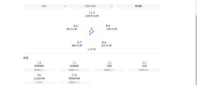 24-25赛季常规赛,范子铭场均6.9分4篮板;本赛季7轮过后,他场均4.4分2.7篮板。从数据上看,很难看出他是一名拿顶薪合同的球员。