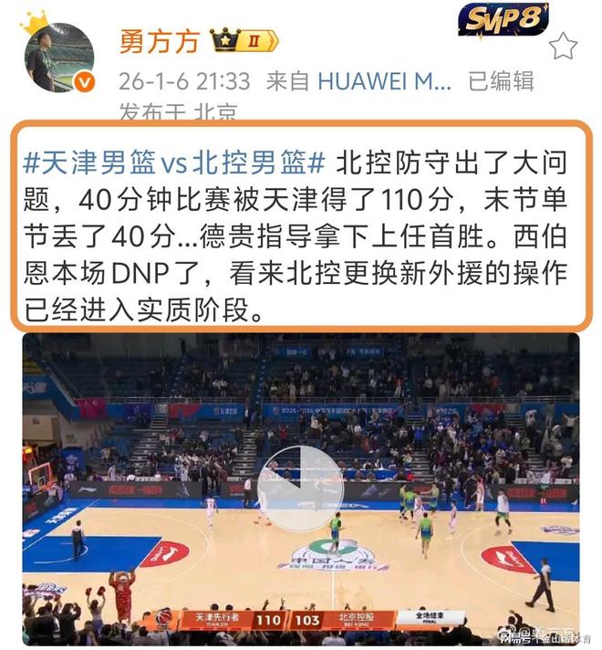 媒体人勇方方,在赛后对北控的防守提出质疑,他在社媒发文讲道。“北控防守出了大问题,40分钟比赛被天津得了110分...德贵指导拿下上任首胜。西伯恩本场DNP了,看来北控更换新外援的操作已经进入实质阶段。 ”。