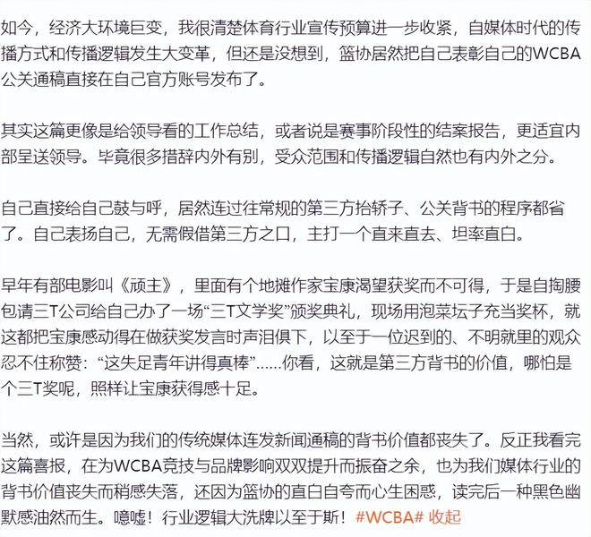知名篮球媒体人付政浩表示:“这种明显带有自夸性质的公关稿件不应是由第三方来发布才更有背书效果和公信力吗?现在都习惯直接‘王婆卖瓜自卖自夸’吗?”