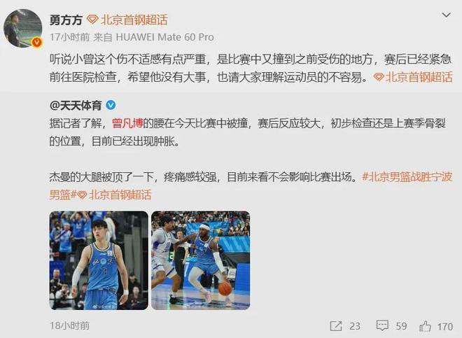 目前为止,北京队官方尚未给出曾凡博的伤情报告,没有消息或许是无碍,也有可能仍在等待进一步的检查情况。