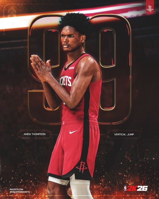 火箭官方:阿门汤普森是2K26唯一弹跳能力值99的球员