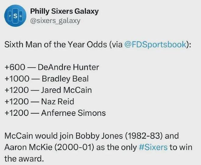 今年8月份中旬,美媒晒出25-26赛季最佳第六人赔率榜单,西蒙斯和里德(森林狼)&麦凯恩(费城)并列第3,亨特(骑士)与比尔(快船)分列前二。