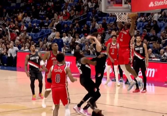 次节回来,乐福三分命中后,阿夫迪亚强突再次走上罚球线,克林根顺下接球也完成双手扣篮,开拓者一波16-6反超鹈鹕2分。锡安冲击篮筐,顶着两人防守滞空拉杆上篮打中,及时止血,随后接球顺下,高高跃起完成单臂炸筐暴扣,鹈鹕重新领先到4分。开拓者后场断球两次传导,夏普直接起飞暴扣终结,卡马拉和阿夫迪亚接连命中三分,半场战罢,开拓者63-55领先鹈鹕8分。