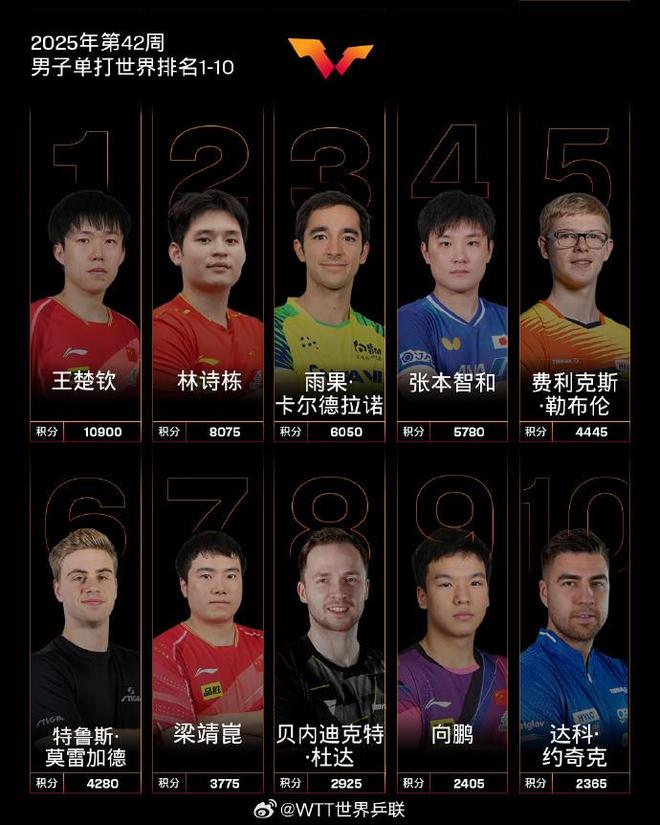 北京时间今日,国际乒联官方公布了2025年第42周世界排名。