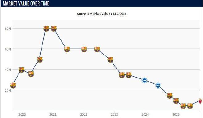 在最新一期的身价更新中,法蒂的身价上涨了500万欧元,达到了1000万欧元,他的巅峰身价是2020年8月为巴萨效力时,当时他的身价达到了8000万欧元。