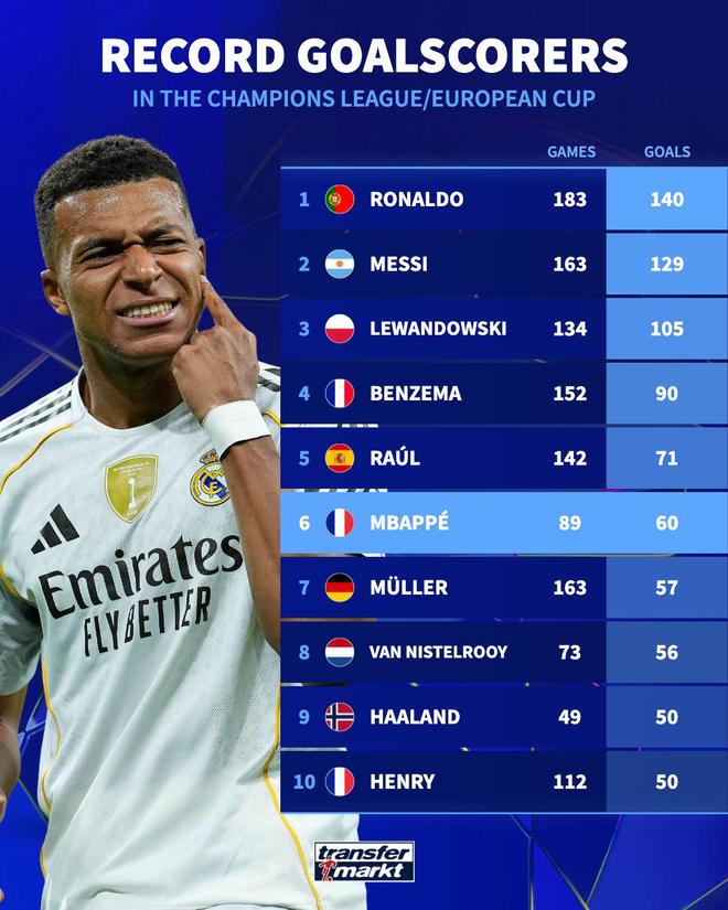 姆巴佩也凭借此帽子戏法使得个人欧冠进球数来到60粒,超越穆勒,仅次于C罗、梅西、莱万、本泽马和劳尔。赛后欧冠官方社媒也对姆巴佩表示了祝贺。