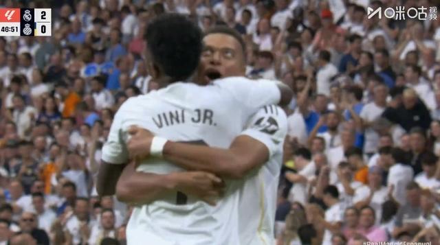 直播吧09月20日宣 皇马vs西班牙人比赛第46分钟,维尼修斯横传,姆巴佩禁区外原地摆腿远射破门,5场西甲打进5球,皇马2-0领先西班牙人。
