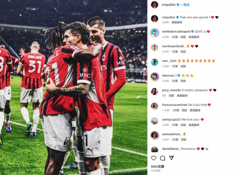 普利西奇也通过社媒晒出他和丘库埃泽相拥庆祝的照片,并配文:“那很特别!!❤️