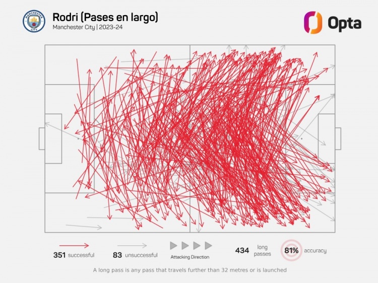 OptaJose的统计,罗德里在2023/24赛季各项赛事完成351次长传,他是五大联赛各项赛事同期完成长传次数最多的球员。