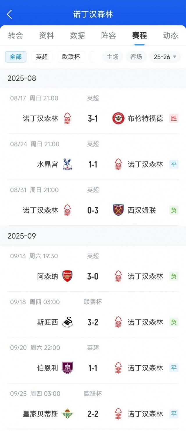 直播吧09月25日宣 欧联杯首轮,诺丁汉森林2-2遭贝蒂斯绝平,近1个月1胜难求。