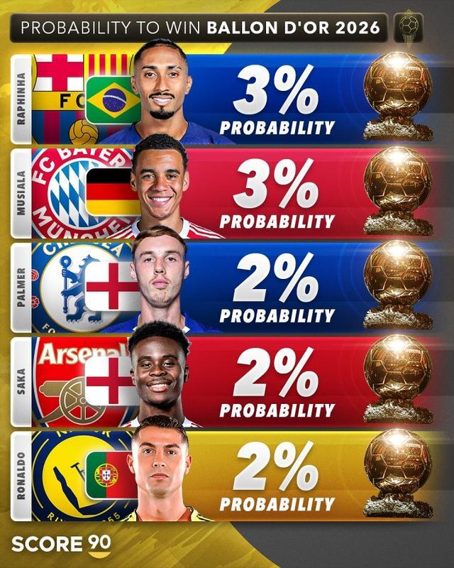 直播吧09月26日宣 外国媒体SCORE90根据相关机构赔率,列出了2026年金球奖获奖概率,其中巴萨前锋亚马尔以18%的概率领跑。