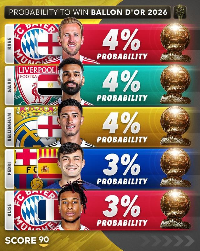 外媒列2026金球概率:亚马尔18%领跑,姆巴佩17%,登贝莱5%