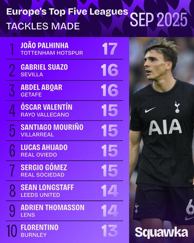 当地时间10月1日,知名数据机构Squawka发布了五大联赛九月份铲球榜,热刺中场帕利尼亚以17次铲球位居榜首。
