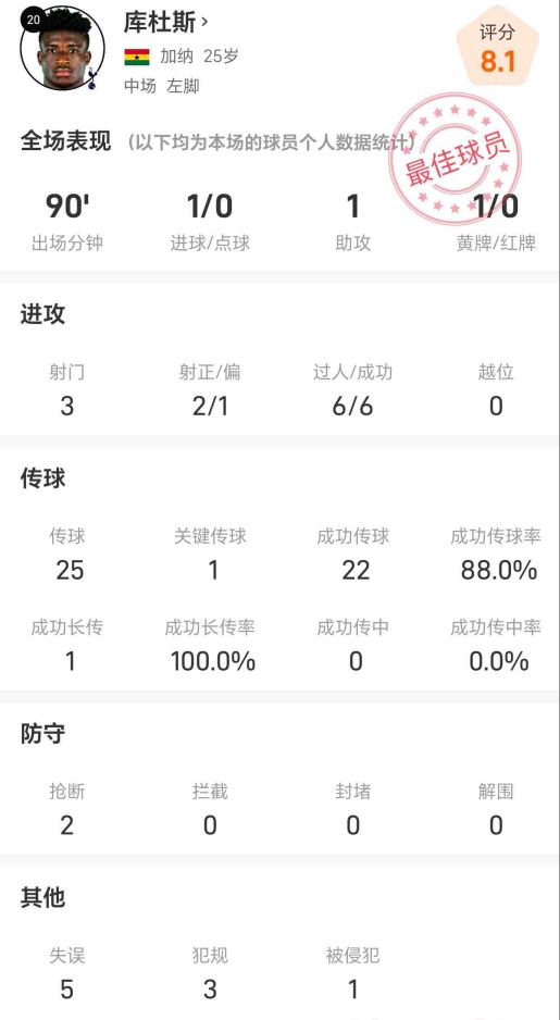 雷速体育10月4日宣 英超第7轮,热刺2-1利兹联,此役,库杜斯首发出场,他全场比赛数据如下:出场90分钟,射门3次,打进1球,助攻1次尝试过人6次,成功6次传球25次,传球成功率88%,关键传球1次抢
