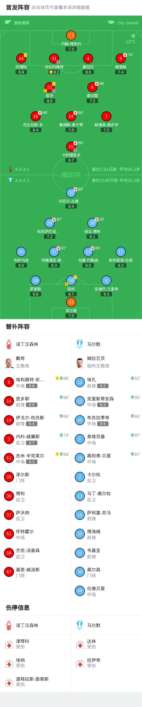 诺丁汉森林30马尔默,耶茨、卡利穆恩多、米伦科维奇建功