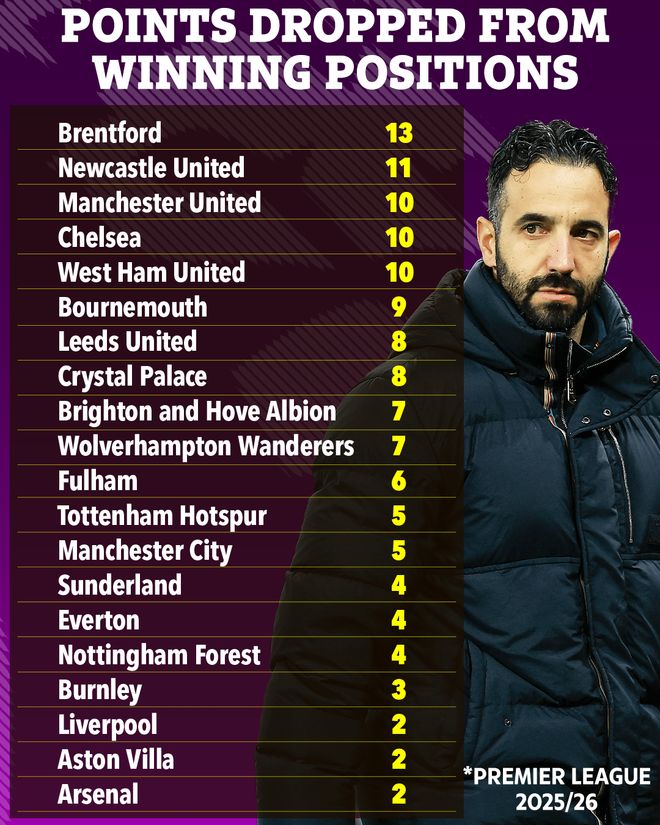在4-4战平伯恩茅斯之后,一项数据显示,阿莫林的球队领先情况下丢掉了10分,在英超并列第三多,仅次于布伦特福德(13分)和纽卡斯尔联(11分)。