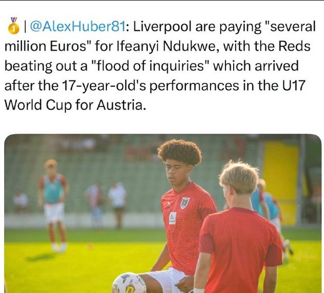 名记通稿:利物浦将在夏天签下奥地利17岁中卫Ifeanyi Ndukwe,后者是带领奥地利杀入U17世界杯决赛的主力中卫。利物浦在雪片似的报价中胜出,为此将付出几百万欧元。