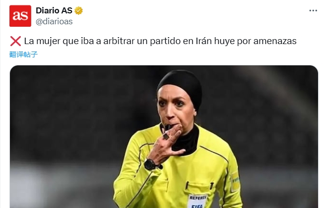 伊媒:伊朗女裁判被威胁泼硫酸,现已移民至某欧洲国家