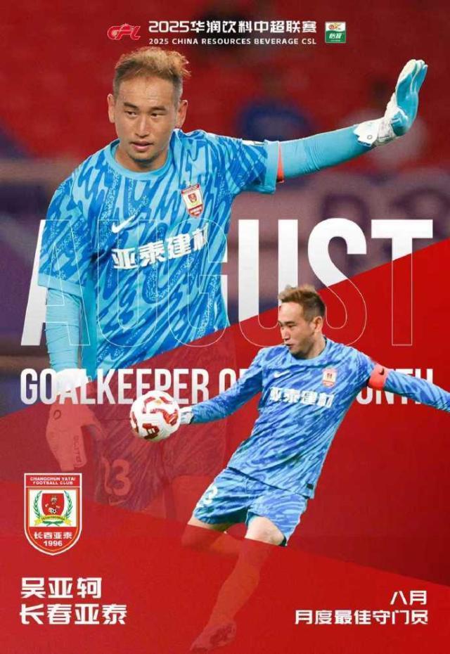 9月25日,中超联赛官方公布了8月最佳守门员,来自长春亚泰的吴亚轲当选。